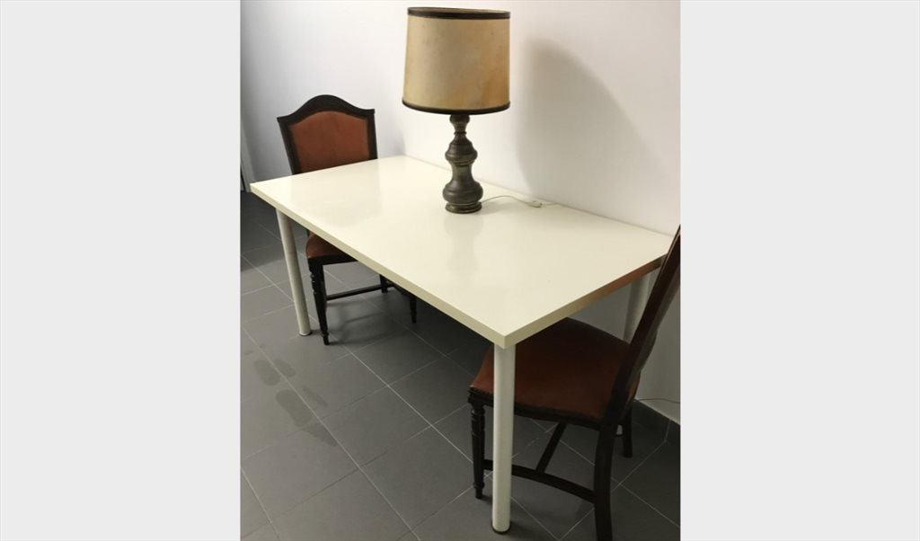 - Zona Comum, para refeições e/ou trabalho, com mesa, cadeiras e candeeiro, móvel de gavetas, bengaleiro, porta guarda-chuvas e relógio .