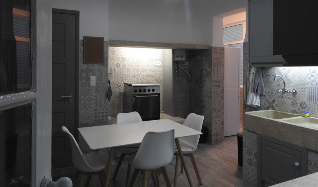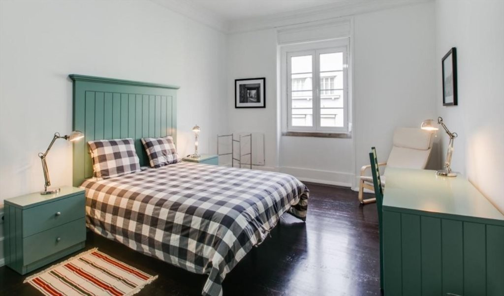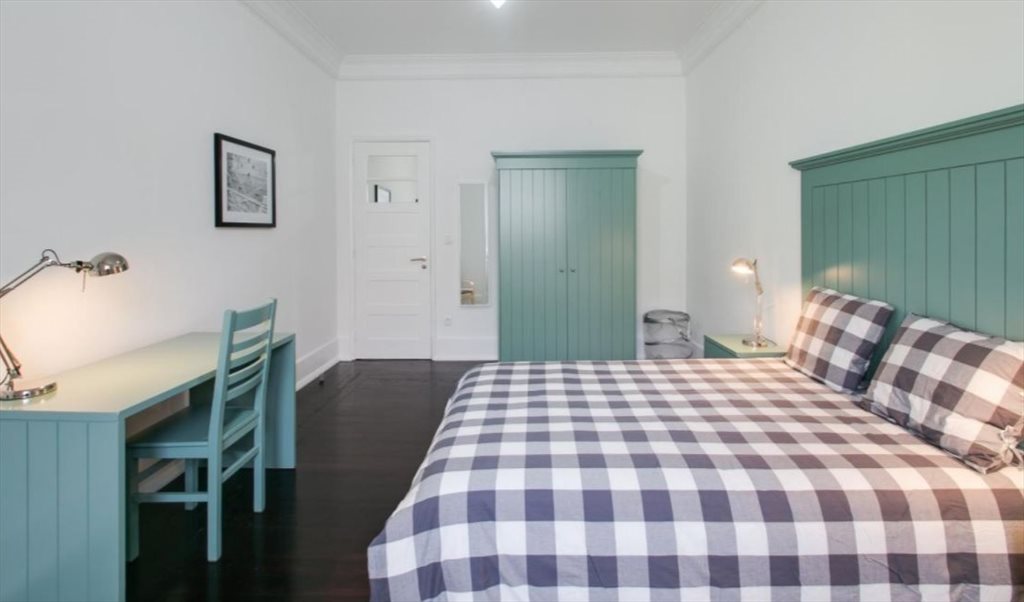 O apartamento de 210m2 com janelas de vidro duplo é composto por 6 quartos, 4 com camas de casal e 2 com camas individuais, todos com janelas e equipados com aquecimento central, mesas de cabeceira, secretárias, cadeiras e roupeiro.