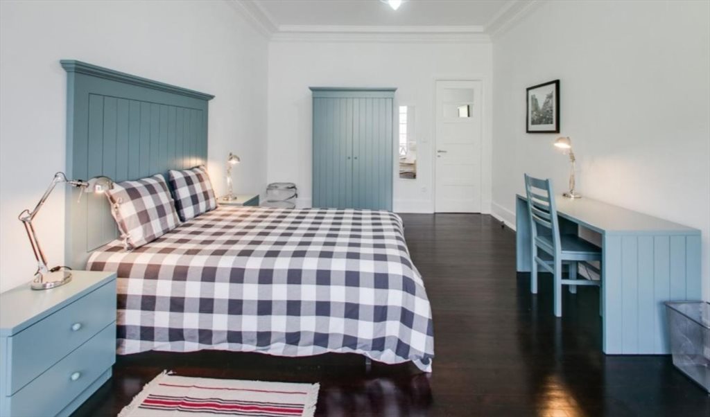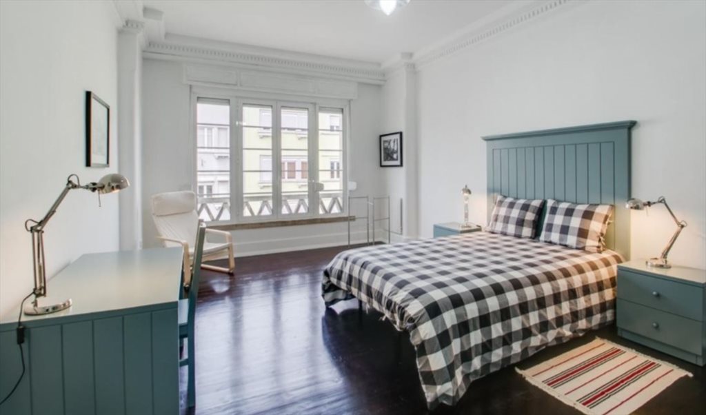 O apartamento de 210m2 com janelas de vidro duplo é composto por 6 quartos, 4 com camas de casal e 2 com camas individuais, todos com janelas e equipados com aquecimento central, mesas de cabeceira, secretárias, cadeira, cadeirão e roupeiro.