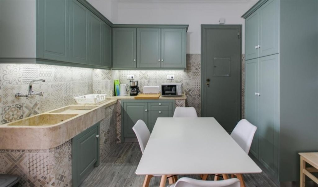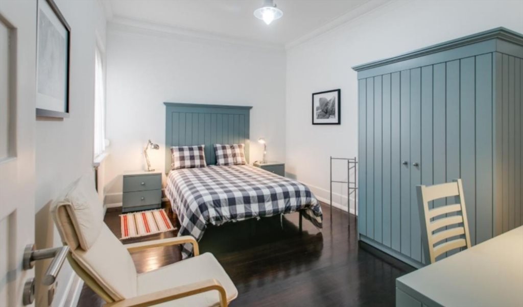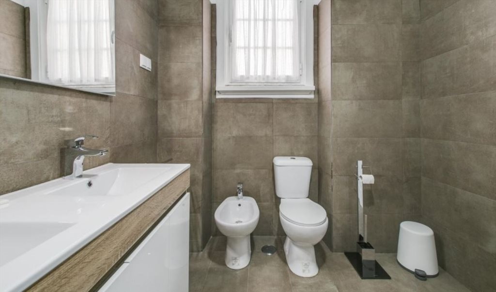 O apartamento de 210m2 com janelas de vidro duplo é composto por 6 quartos, 4 com camas de casal e 2 com camas individuais, todos com janelas e equipados com aquecimento central, mesas de cabeceira, secretárias, cadeiras, 1 cadeirão e roupeiro.