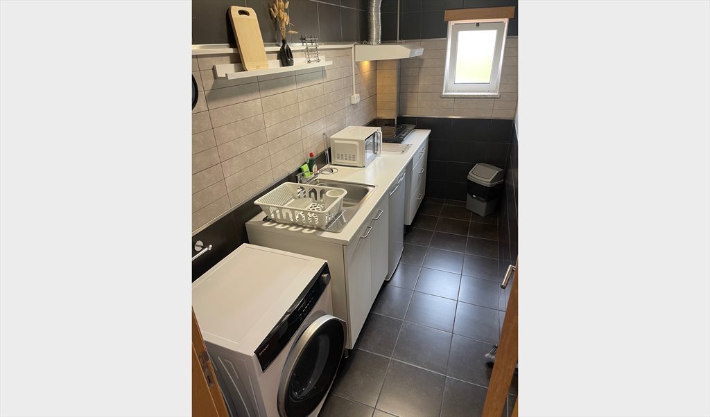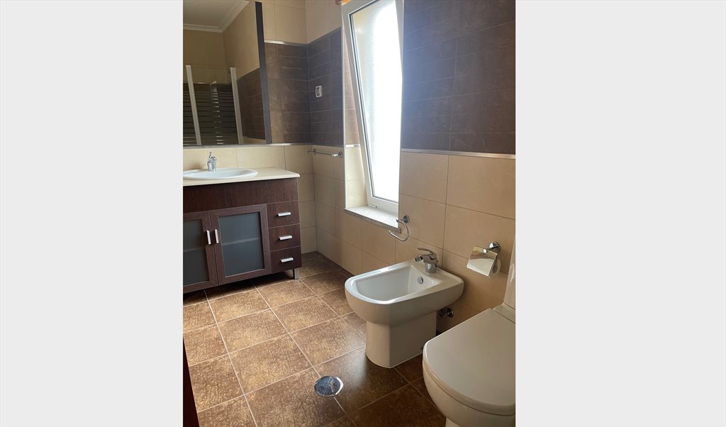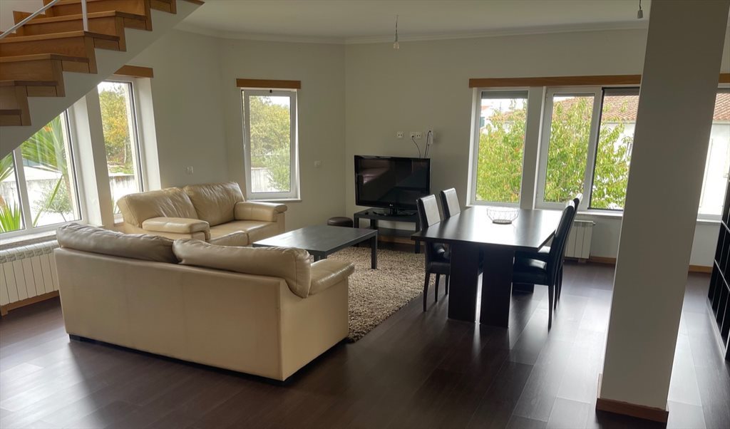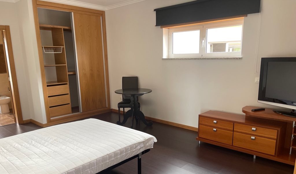 Quarto mobilado e com tv, cozinha equipada, a casa de banho é privativa e tem banheira.